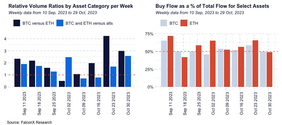 FalconX Trading Desk Color: BTC continues to dominate flows at our desk. BTC traded 3.0x more than ETH over the past week, lower than the 4.2x recorded in the previous week but still one the third-highest print for this ratio in 2023. Flow from certain investor personas turned more bearish over the past week (notably prop trading desks and retail aggregators). As a result, 50% and 49% of our BTC and ETH flow were on the buy side (versus 59% and 66% over the past week, respectively). With relatively few exceptions, interest in alts remains subdued. Majors BTC and ETH traded 2.6x more than alts, the highest level of the past four months, with most of the action tilted slightly toward the sell side.
