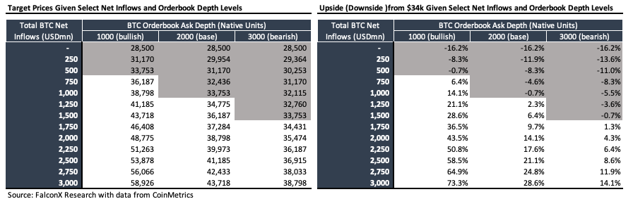The tables below show the BTC price impact, starting at the $28,500 level before this rally, with a certain amount of net inflow hitting the orderbook under different scenarios. The inflows are assumed to vary between zero and $3 billion. The 1% book depth in native units is assumed to vary from 1,000 (more positive for price impact) to 3,000 (less positive for price impact) versus the typical historical level of 2,000.