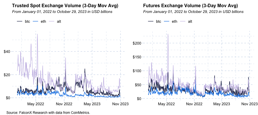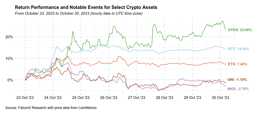 BTC was the star of the show as it traded around the $35,000 level for the first time since May 2022 on the back of increasing excitement about the likely upcoming spot ETF launch (more on that later). DYDX was up over 20% after it open-sourced its V4 code, marking the initiation of its much-expected transition from Ethereum to its own blockchain in Cosmos. On the other hand, MKR and UNI were some of the few assets that recorded a negative return last week. While the former was mostly correcting from a strong recent performance, the latter continues to be impacted by controversy around Uniswap Labs adding a 15-bps fee (not for the protocol itself, only at the front-end level) for certain key markets.