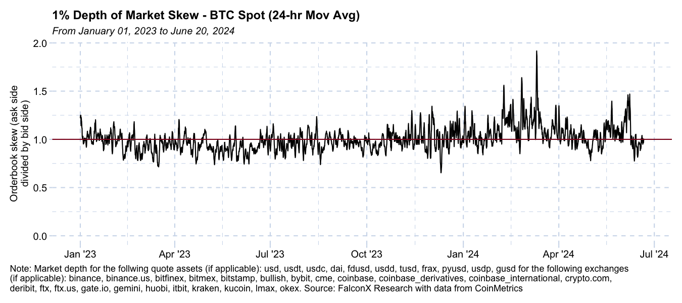 While the price rallies in the fourth quarter of 2023 were accompanied by a flat order book skew, the rallies in 2024 have seen increasing sell pressure (i.e., the lines above spiking up, especially for BTC).