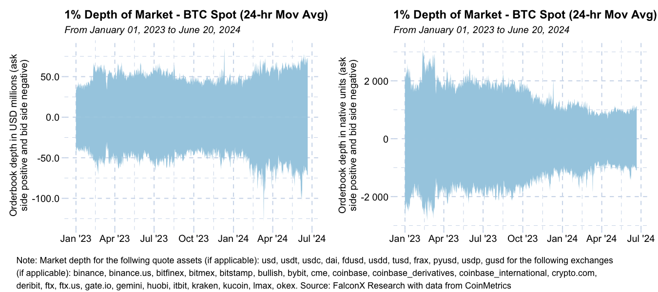 The charts below show the BTC and ETH 1% book depth (in USD on the left and native units on the right), with the ask side of the book showing positive values and the bid side showing negative values. Orderbook trends have not changed very often, but they have been consistently expanded over the past few months to reach the highest values in the past year.