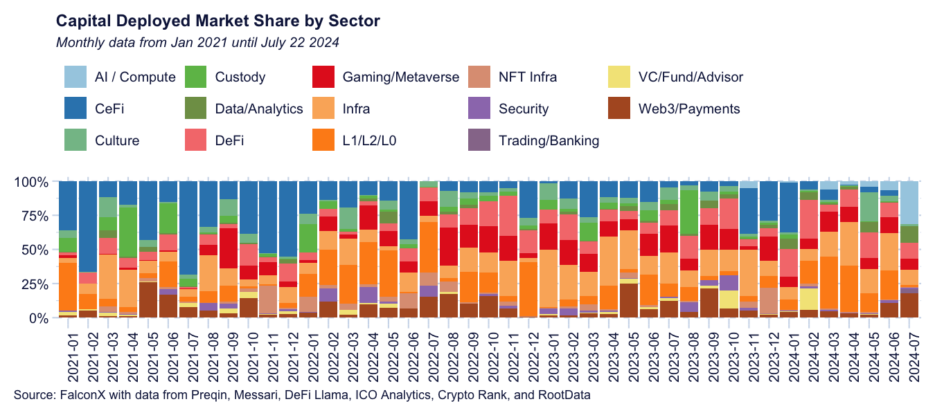 Two noteworthy verticals this month were AI/Compute, led by Sentient’s $85 million seed raise led by Founder’s Fund, and Web3/Payments, with blockchain payment network Partior’s $60 million series B raise led by XV Partners with participation from the likes of Jump Trading. These two deals alone accounted for almost a third of the total capital raised in July.