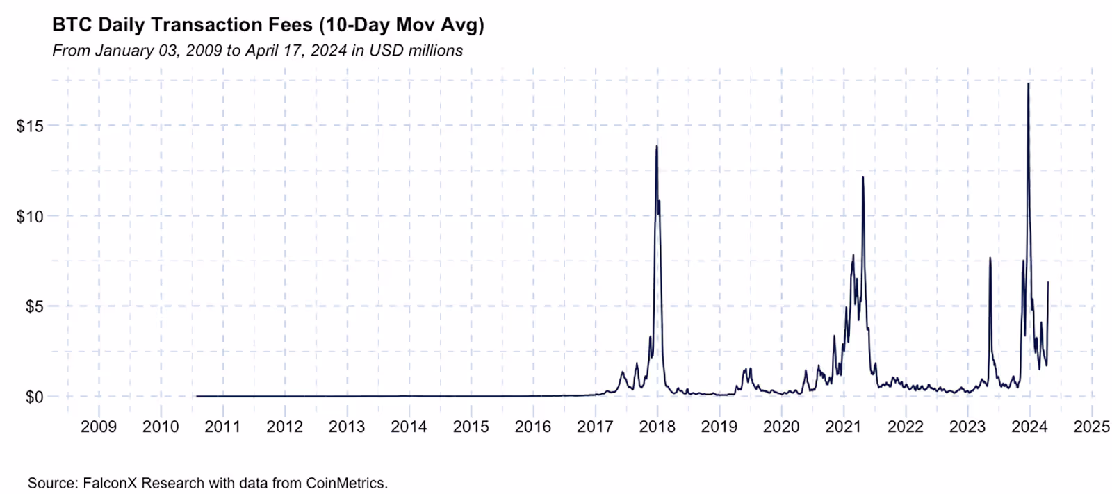 Bitcoin Transaction Fees on the Rise: Signaling a Memecoin Resurgence? Recently, Bitcoin transaction fees have consistently exceeded the $5 million mark daily. For context, such levels have been observed less than 3.5% of the time, predominantly during the peak of bull markets in 2017 and 2021 and during the ordinals/memecoin frenzies of 2023.