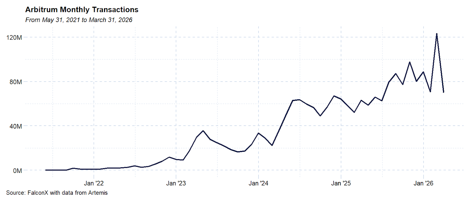 Based on how Arbitrum trades relative to its peerset, the market may be discounting the incremental revenue potential of Arbitrum Chain fees, which could improve revenue generation considerably from a recent run rate of $12M. On a relative basis, investors can pay “less” for L2s but still get exposure to growth in blockchain activity. If our estimates for Robinhood Chain activity prove accurate and ARB’s valuation stays the same, it could ultimately trade below a multiple of 40X FDV/Fees, which is comparable to today’s leaders on the app side, such as HYPE. Of course, this is just theory until Arbitrum’s partner blockchains see traction (so far Robinhood’s testnet saw 4M transactions in its first week). The future of L2s like Arbitrum will ultimately depend on the success of these enterprise blockchains.