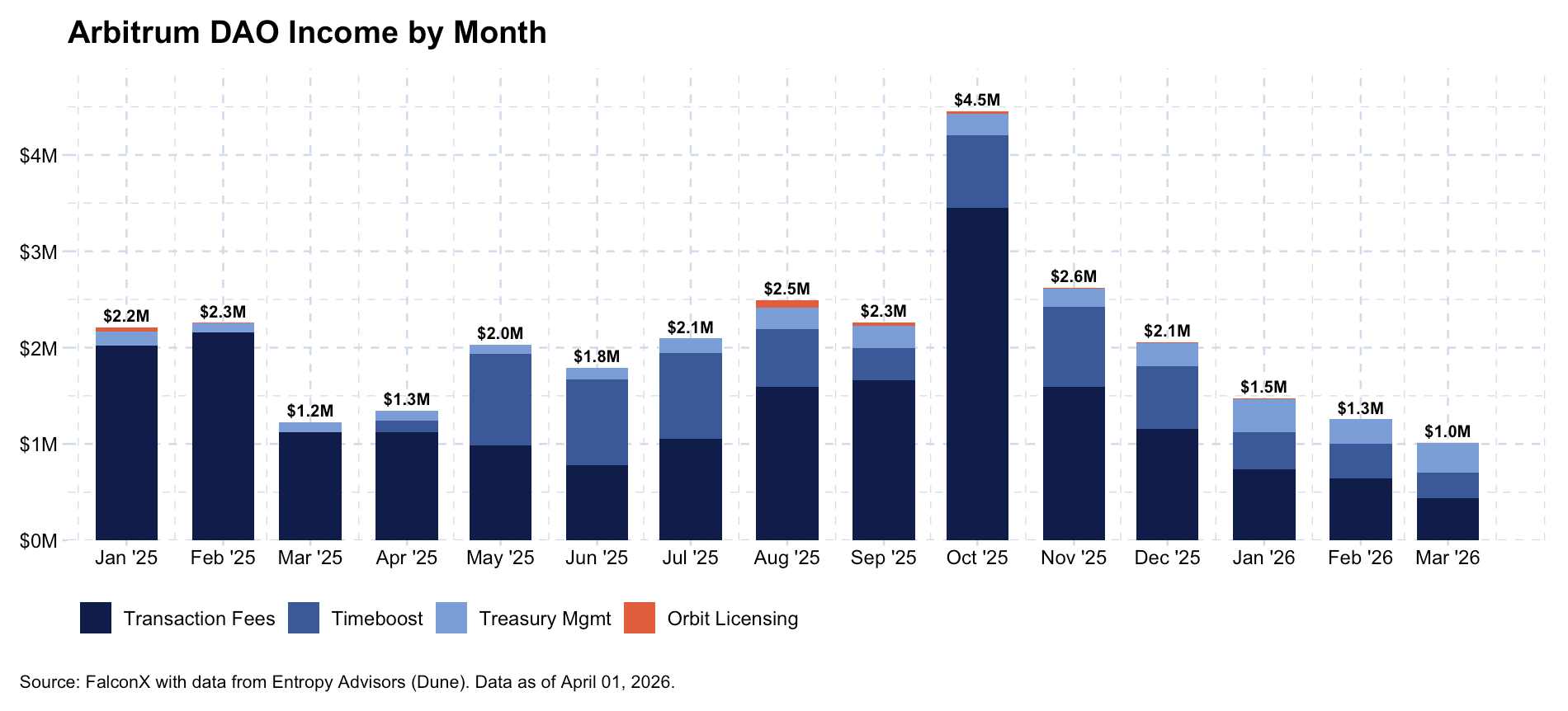 Other core revenue generating activities for the Arbitrum DAO involve Timeboost (MEV capture) and treasury management activities. Timeboost is a transaction ordering policy for Arbitrum chains, allowing chain owners to capture a portion of maximal extractable value (MEV) that would otherwise go to searchers. This process auctions off the right to a time advantage ahead of normal transactions, allowing them to capture certain MEV. Consequently, MEV seeking actors spend on auctions instead of hardware to win latency races, with 97% of Timeboost proceeds going to the Arbitrum DAO. Timeboost is annualizing over $3M of fees for the Arbitrum DAO, per its March 2026 figures, according to data from Entropy Advisors, generating around 26% of total DAO income. However, considering it has generated $7M of fees within its first year, it is possible the lower run rate reflects softer crypto activity more broadly.
