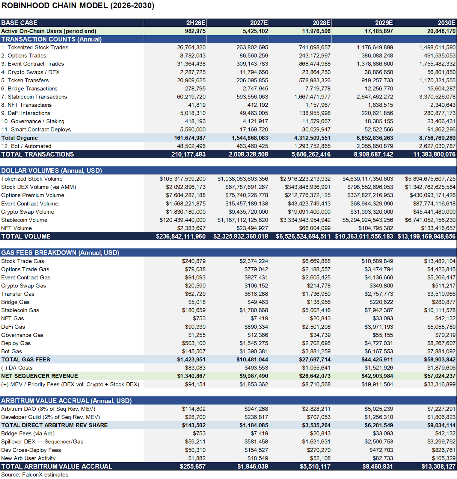Our base-case scenario for Robinhood Chain estimates annual gas fees could approach $60M by 2030. Key to our projections is that users will move to engage with other apps on the L2 more broadly, such as DeFi, driving incremental transaction activity apart from just trading tokenized stocks. This could translate to as much as $7M and $2M to the Arbitrum DAO and Arbitrum Developer Guild, respectively, as well as an incremental $4M in fees from spillover activity to the Arbitrum L2 itself, driving approximately $13M/yr in total to the Arbitrum ecosystem by 2030. Such a scenario would be meaningful considering run-rate annualized Arbitrum DAO income of $12M as of March 2026, per Entropy Advisors. And this is just one chain – if additional chains adopt the stack, aggregate fee flows could change; the magnitude is uncertain.
