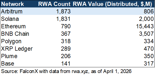 Arbitrum is a leader in the real-world asset space in terms of RWA count and RWA TVL, per data provider RWA.xyz. It is the #1 network in terms of RWA count (1,873 RWAs, as of April 1, 2026) valued at $806M, more RWA tokens than on Solana or Ethereum. Per the Arbitrum team, drivers behind this include growth in tokenized equities (including Robinhood's deployments), tokenized treasury growth (in part through its STEP program), and other assets like commodities and real estate.