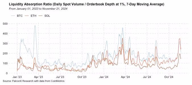 One way to visualize this relationship is through the ratio between daily spot traded volume to the average daily spot order book 1% depth, or what I’m calling the liquidity absorption ratio. The chart below shows this indicator since 2023 for BTC, ETH and SOL.