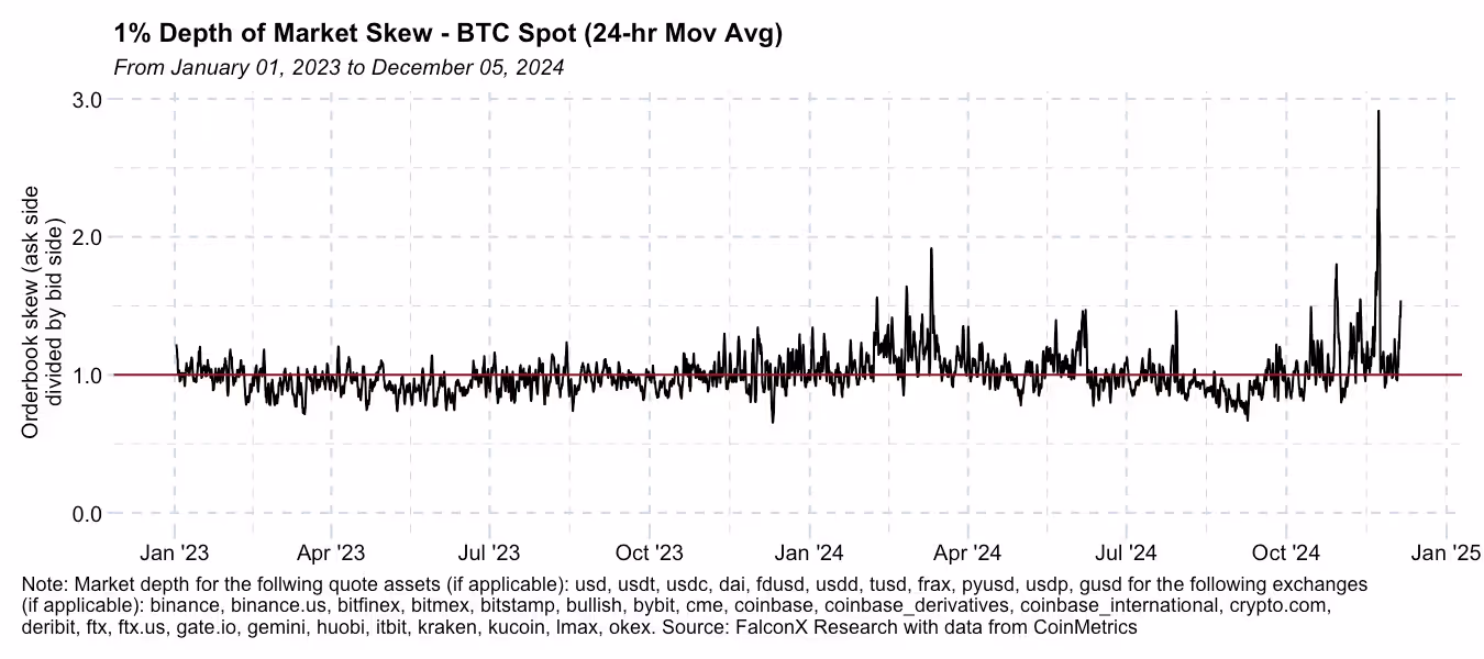 The BTC spot order book skew (ask side divided by bid side) remains tilted towards the sell side. In other words, the executed buy orders were not replaced by new buy flow, which may set up the market for short but quick corrections.