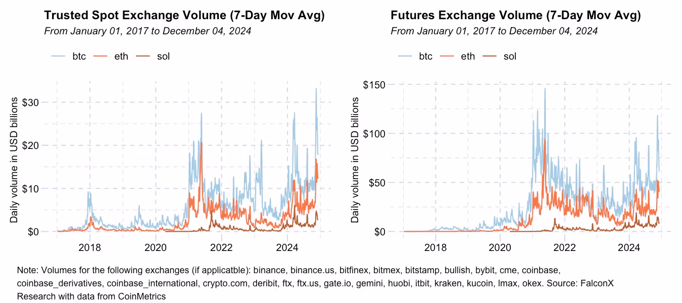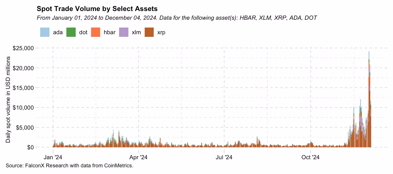 Combined spot volumes for the larger legacy tokens (HBAR, XLM, XRP, ADA, and DOT) rarely hit $3 billion in 2024 pre-election, but now consistently range between $10-25 billion. While XRP dominates this volume, the chart below shows the volume surge extends to the historically less liquid tokens as well.