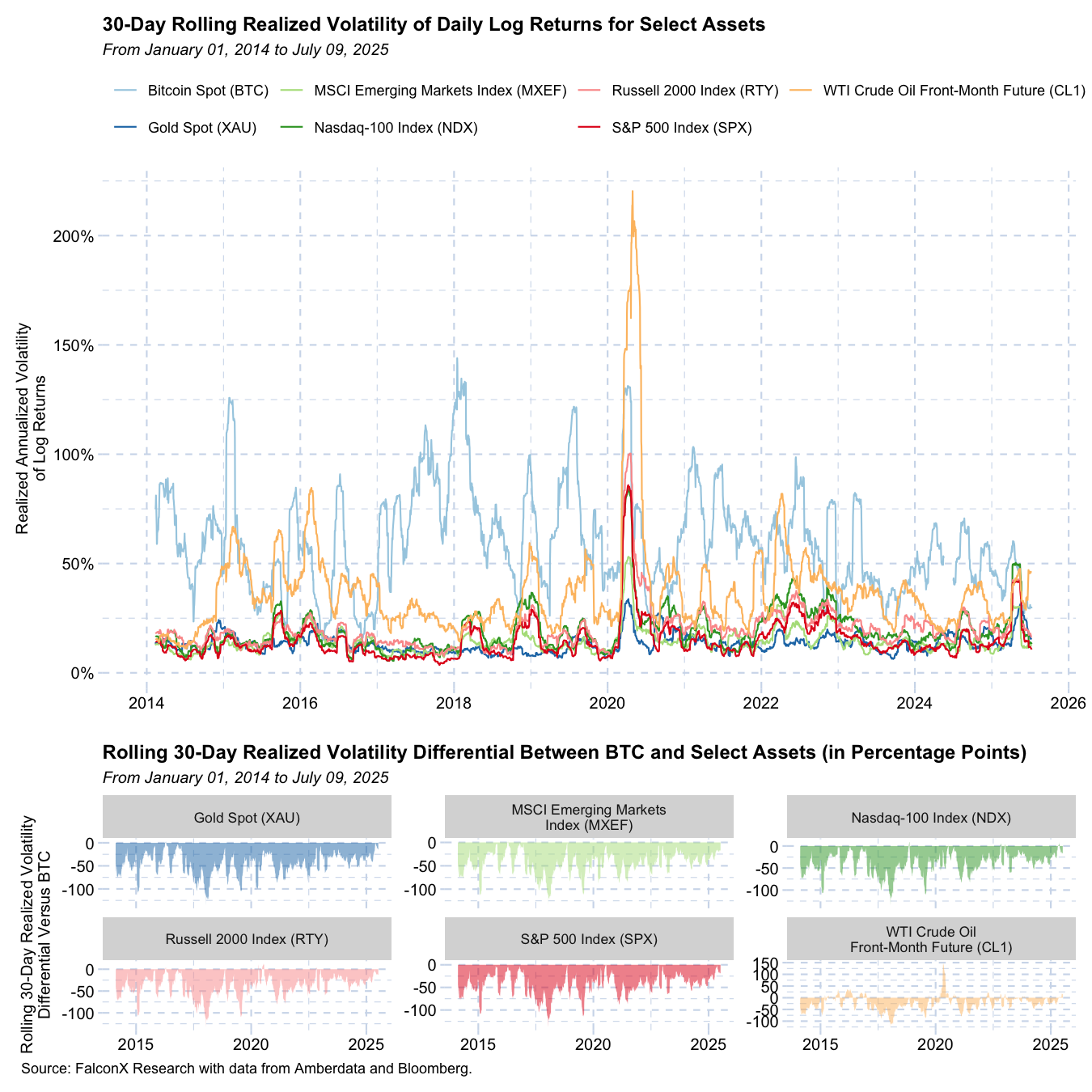 The small charts beneath the main chart highlight this differential. BTC’s volatility has seldom been this compressed versus the key equity indexes and commodities. Notably, BTC is currently exhibiting lower realized volatility than crude oil, an asset traditionally viewed as significantly less volatile.