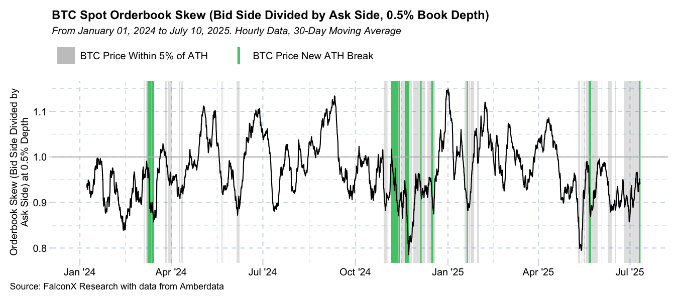 The chart below displays BTC orderbook skew using the same parameters as the previous chart (0.5% depth). The shaded gray areas highlight periods when the BTC price was within 5% of its all-time high at the time, while the green vertical lines mark instances of new all-time-high breakouts.