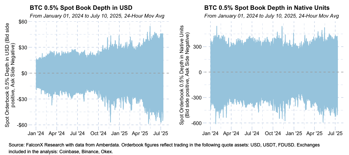 The chart below illustrates the BTC spot orderbook depth at the 0.5% level across some of the main exchanges characterized by higher levels of directional trading activity. The right panel shows depth in U.S. dollar terms, while the right presents the same measure in native units. Observers of orderbook dynamics will recognize that BTC’s market depth has remained remarkably stable in native units across a range of market conditions.