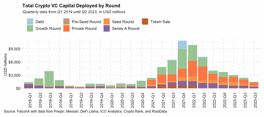Crypto Venture Investing Reach a 3-Year Low: According to data compiled by our market-making team, capital deployment in the crypto industry shrinks sequentially to $1.4 billion in the third quarter of 2023, the lowest value since the third quarter of 2020.