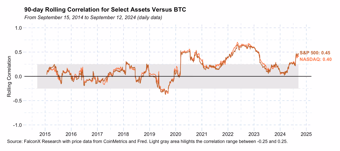Another critical driver impacting prices is the path of U.S. monetary policy and overall macro conditions. Correlations between BTC and the leading broad equity indices (S&P 500 and the Nasdaq) are approaching levels not seen since the mid-sized banking crisis in 2023.