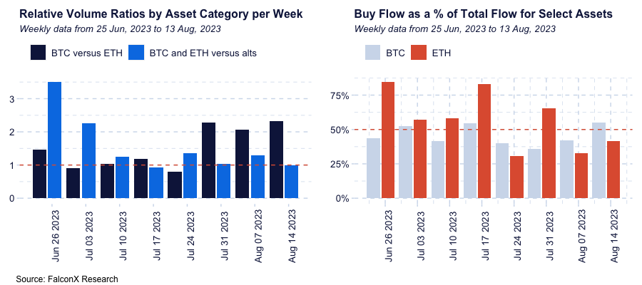 FalconX Trading Desk Color: BTC and alts were the highlights of our trading activity last week, in which we generally saw flows skewed to the sell side. BTC traded 2.3x more than ETH, the highest ratio of the past two months. While 55% of our BTC flow was on the buy side, 58% of our ETH flow was on the sell side. Interest in alts remains elevated, with majors BTC and ETH trading less than alts for only the second week in the last five months. Alts flow generally tilted toward the sell side but varied across assets. We saw LTC, MATIC, and DOGE flow primarily on the buy side and SOL, OP, and BCH primarily on the sell side.