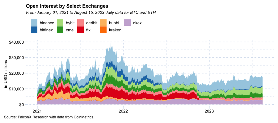 Open Interest Build-Up in 2023 Suggests Whenever Volatility Returns, It Might Come Back With no Forewarning: The open interest in ETH and BTC futures (both perpetual and dated contracts) increased by over 50% to $18 billion so far in the year. As the chart below shows, this level is only 10% below the level before the FTX downfall.