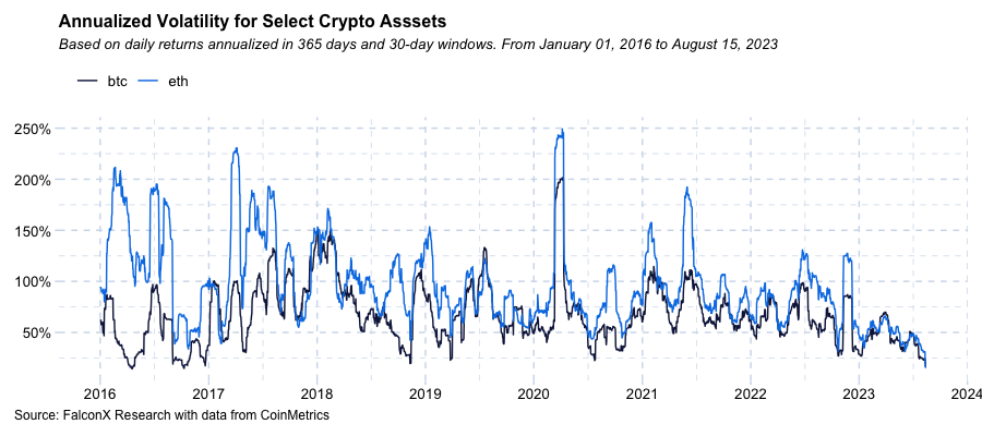 Crypto Goes Deeper Into its Low Volume, Low Volatility Mode: The 30-day annualized realized volatility for BTC and ETH stand at 16%. This is the lowest level recorded for BTC since the fourth quarter of 2016 and the lowest for ETH. To get a context of how extremely low these levels are, volatility levels below 20% have historically occurred only 1.7% and 0.1% of the time for BTC and ETH since 2016.