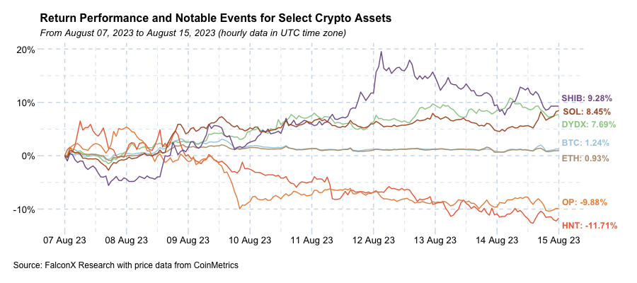The positive highlights of the week among the more prominent names were memecoin SHIB, which announced plans to launch a digital ID feature, SOL, which continues to recover and sustain its status as one of the few large crypto assets with tripe-digit gains so far in 2023, and DYDX, which just launched its second testnet in its journey to launch its Cosmos-based appchain. On the other hand, OP was down almost 10% as it retrenched from the strong performance over the past few weeks fueled by strong activity on Optimism-based projects Worldcoin and Base.
