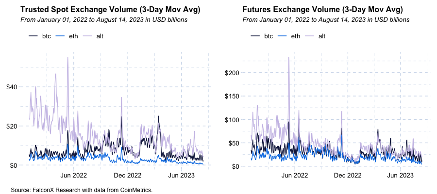The low-volatility environment is underpinned by thin trade volumes both in the spot and futures markets. For example, under my favorite spot volume metric (3-day moving average of CoinMetrics trusted exchange volume), BTC and ETH just hit the lowest prints since October 2020. Alts spot volume, which until recently was showing relative strength, dipped this week and is now brushing the 2023 lows.