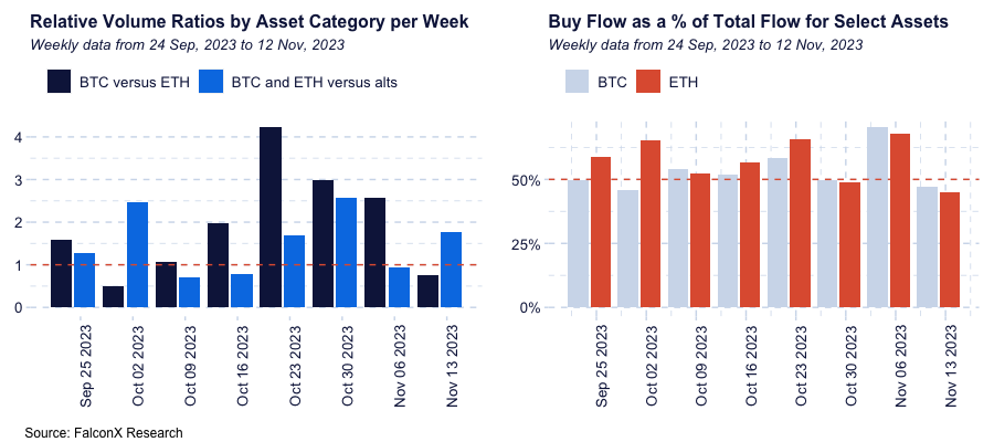 FalconX Trading Desk Color: ETH traded more than BTC at our desks for the first time since the last leg of the rally in October and sustained the trend of shrinking BTC volume dominance at our desks that we have been pointing out over the past few weeks. Most investor personas were buyers, but bullish activity was concentrated in relatively few names. Notably, our BTC and ETH flows flipped to neutral or slightly to the sell side (50% and 45% of total flows on the buy side, respectively) from firmly on the buy side last week. Alts volume picked up and stood at 1.77x of majors, with increasing interest in select names such as SOL, NEAR, SAND, and others. Besides a few assets sustaining strong narratives and attracting investor interest, buy/sell ratios among alts stood slightly below 1x.
