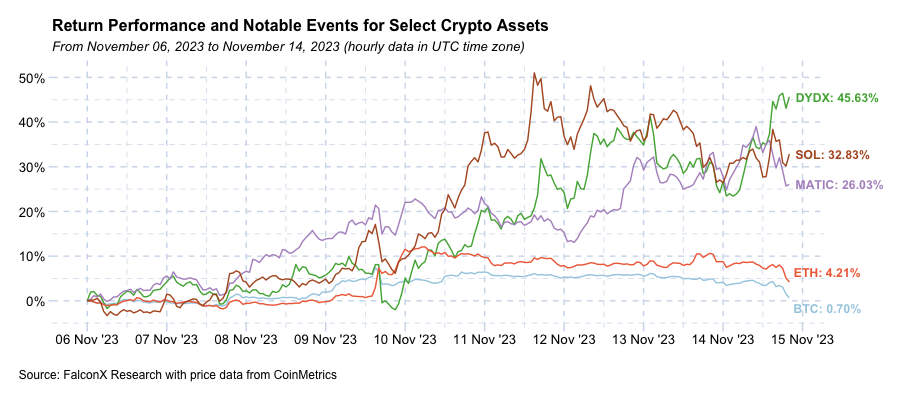 ETH outperformed BTC for the second straight week, but the main positive highlights were alts. DYDX was the best performer among the main assets as it continues to progress toward launching its own Cosmos-based blockchain. SOL effortlessly broke above the $45 resistance level and, despite the recent correction, remains the best-performing crypto asset of the year. Finally, MATIC continues to rehearse a recovery from a dismal return so far in the year.