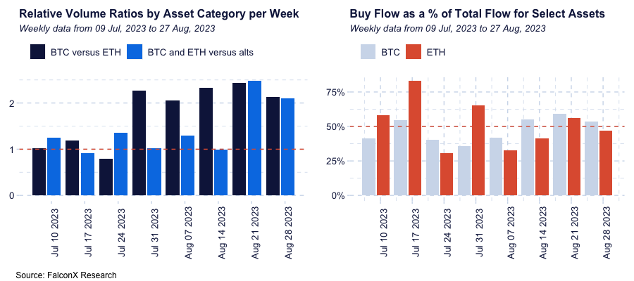 FalconX Trading Desk Color: BTC traded 2.1x more than ETH and continued to dominate our desk activity over the past week. While our BTC flow was mainly on the buy side (52% of our total hedge fund flow and 59% of our total retail aggregator flow), our ETH flow was more mixed (59% of our hedge fund flow was on the sell side and 70% of our retail aggregator flow was on the buy side). All in, buy/sell ratios in BTC surpassed ETH’s for the fourth week in a row. Alts volumes remained subdued, as majors BTC and ETH traded 2.1x more than alts. We saw most alts flow tilted towards the sell side, with a few notable exceptions such as ARB, OP, and LINK.