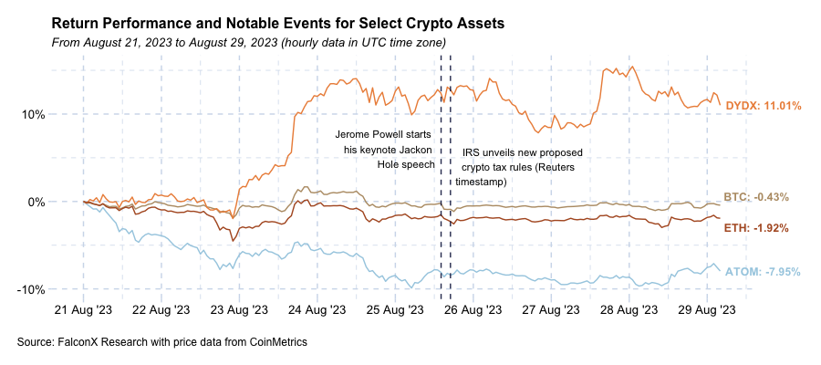 Majors BTC and ETH rehearsed a recovery and were almost 2% in the week, but the small gains were erased in anticipation of and after Jerome Powell’s keynote Jackson Hole speech, which struck a hawkish tone and negatively impacted risk assets more generally. Just a few hours after Powell started his speech, the IRS proposed new tax rules for crypto brokers, exchanges, and payment processors as result of Biden’s 2021 infrastructure bill. Although the industry is still digesting the documents, some policy experts are voicing some concerns, such as the too broad definition of a “digital asset broker”.