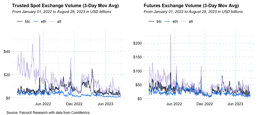 Crypto Volumes Renew Year Lows, Focus on How Activity Recovers Post Labor Day: My favorite metric for crypto spot volumes (3-day moving average of total spot volumes as per CoinMetrics’ trusted exchange framework) just hit a new low for 2023. In August 28, BTC volumes registered $1.6 billion, ETH volumes $470 million, and alts $9.8 billion. For context, one would need to go back to October 2020 to find lower numbers than these.