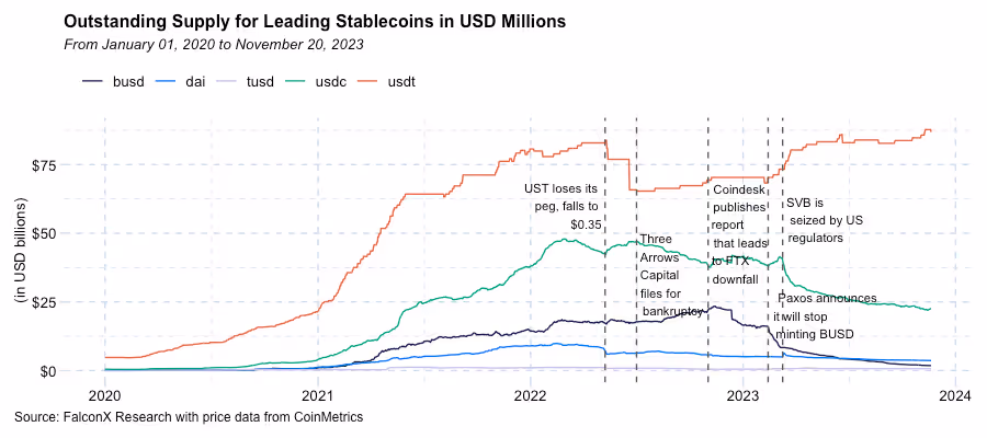 The crypto market experienced subdued price action, with BTC hovering around $37k and the total market cap slightly below the year's high, as Binance's settlement of $4.3 billion for anti-money-laundering violations resolved a significant market overhang. Despite Binance's declining trade volume market share, the market's calm response suggests relief at the resolution, while USDT's supply hits an all-time high, further asserting its dominance over rival USDC.