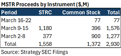 MSTR’s total BTC holdings is now 762K and compares to 786K for IBIT (as of March 25, 2026), a gap it continues to close despite softer market conditions. Key to its recent traction in purchases has been issuance through its STRC preferred stock. At the start of the month, MSTR increased the STRC dividend rate by 25 bps to 11.5%, which proved meaningful enough to drive demand from investors. This has enabled it to raise around $1.6B through this instrument in March so far, potentially helping power as much as 50% of its total BTC purchases in the month. This compares to $78M of STRC issuance in February, suggesting the stepped-up dividend rate may have had a key role to play in driving investor interest.