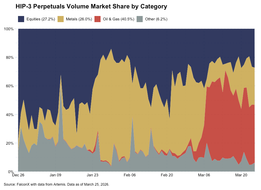 The Iran conflict appears to be driving record activity on Hyperliquid’s HIP-3 markets, where volumes have shifted from markets on metals to those on oil as developments unfold. Hyperliquid is one of the few major venues where traders can express views when traditional markets are closed on the weekends, and seems to have benefited from increased awareness around its offerings. This can help explain HYPE’s relative strength, up nearly 25% MTD as of March 25, per data from Artemis.
