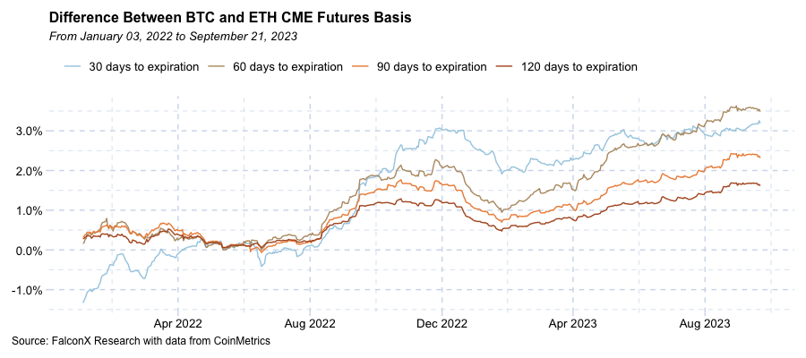 One measure of how ETH staking has been incorporated by institutions is the difference between ETH and BTC basis (i.e., the difference between futures and spot prices) in the CME, a venue used exclusively by institutional investors. The reason is simple: Given that ETH now derives a native yield and BTC does not, the difference between the BTC and the ETH basis should approximate this yield because it reduces the futures contract carry cost.