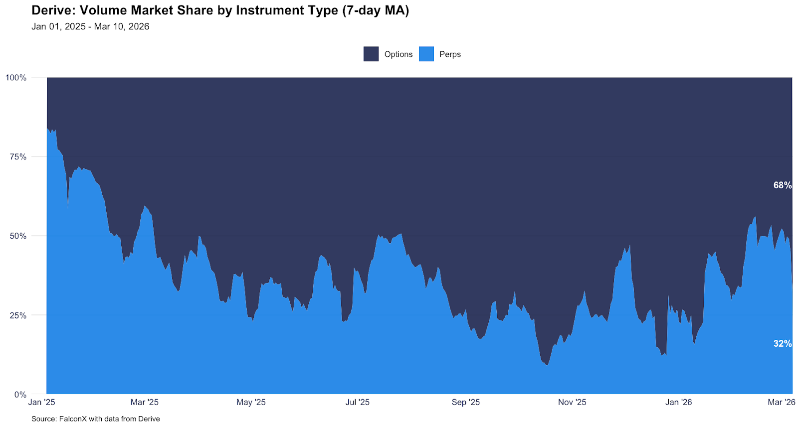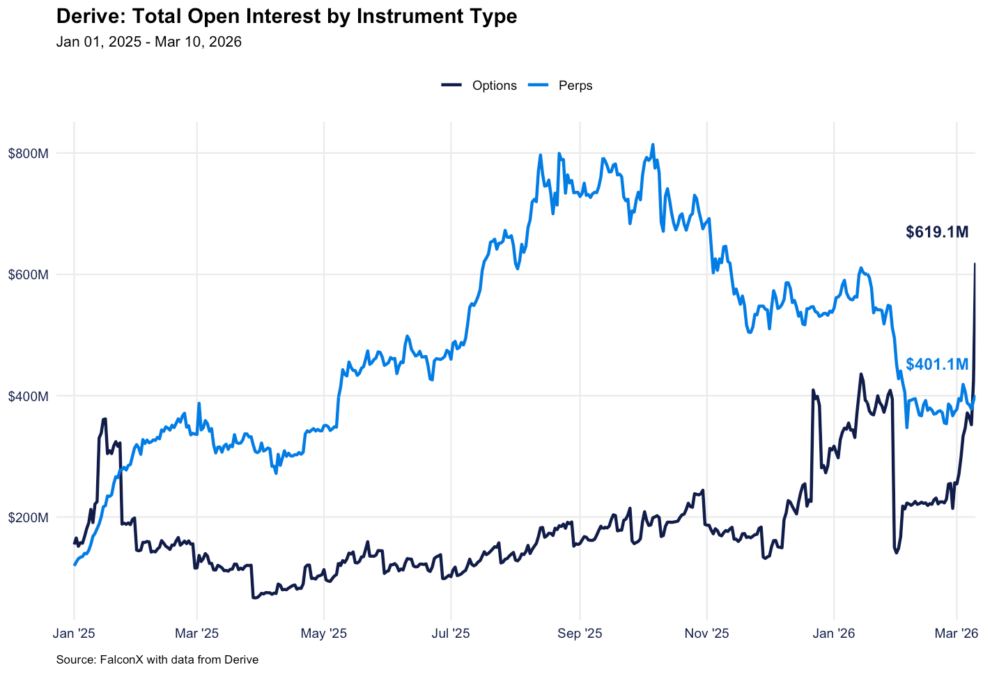 Activity on Derive has ramped up sharply in recent weeks, posting volumes of over $1B notional in February 2026, a record when comparing its post-airdrop activity. This momentum has accelerated into March, pushing total open interest over $1B as of March 10. This latest surge has been aggressively driven by options, which now comprise 61% of total open interest compared to 39% for perps, a rapid structural shift from the end of February when perps still held the majority share.