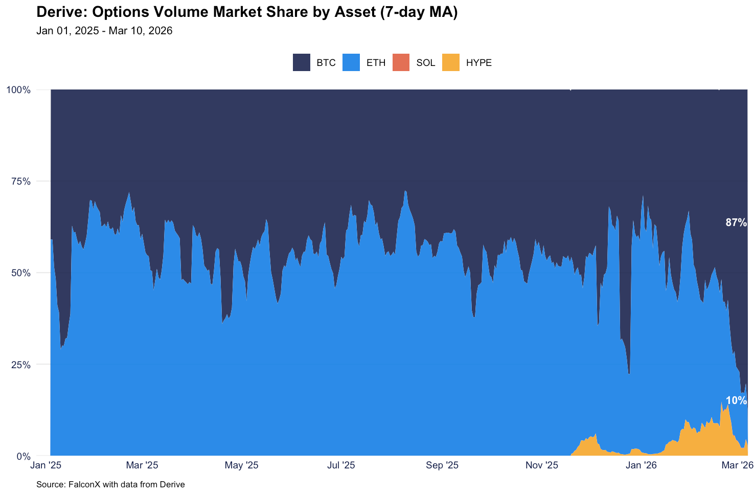 After years of building, Derive’s activity is ramping up around recent market volatility, with record on-chain options volume of $294M for the week ending March 7, 2026. It comes as the crypto options complex has grown immensely in the past year. BTC options notional open interest totals around $63B across leading venues as of Mar 10, 2026, up from roughly $39B a year ago.1 Derive is just 0.8% of this market today in open interest terms, per data from Coin Metrics, but could capture a growing share over time as one of the few decentralized players in this space. Indeed, its daily notional option volumes have grown to nearly 8.0% of Deribit’s as of March 10. Hyperliquid demonstrated decentralized exchanges could compete with centralized venues in perps, and Derive may deliver the same in the options space as on-chain options trading proliferates.