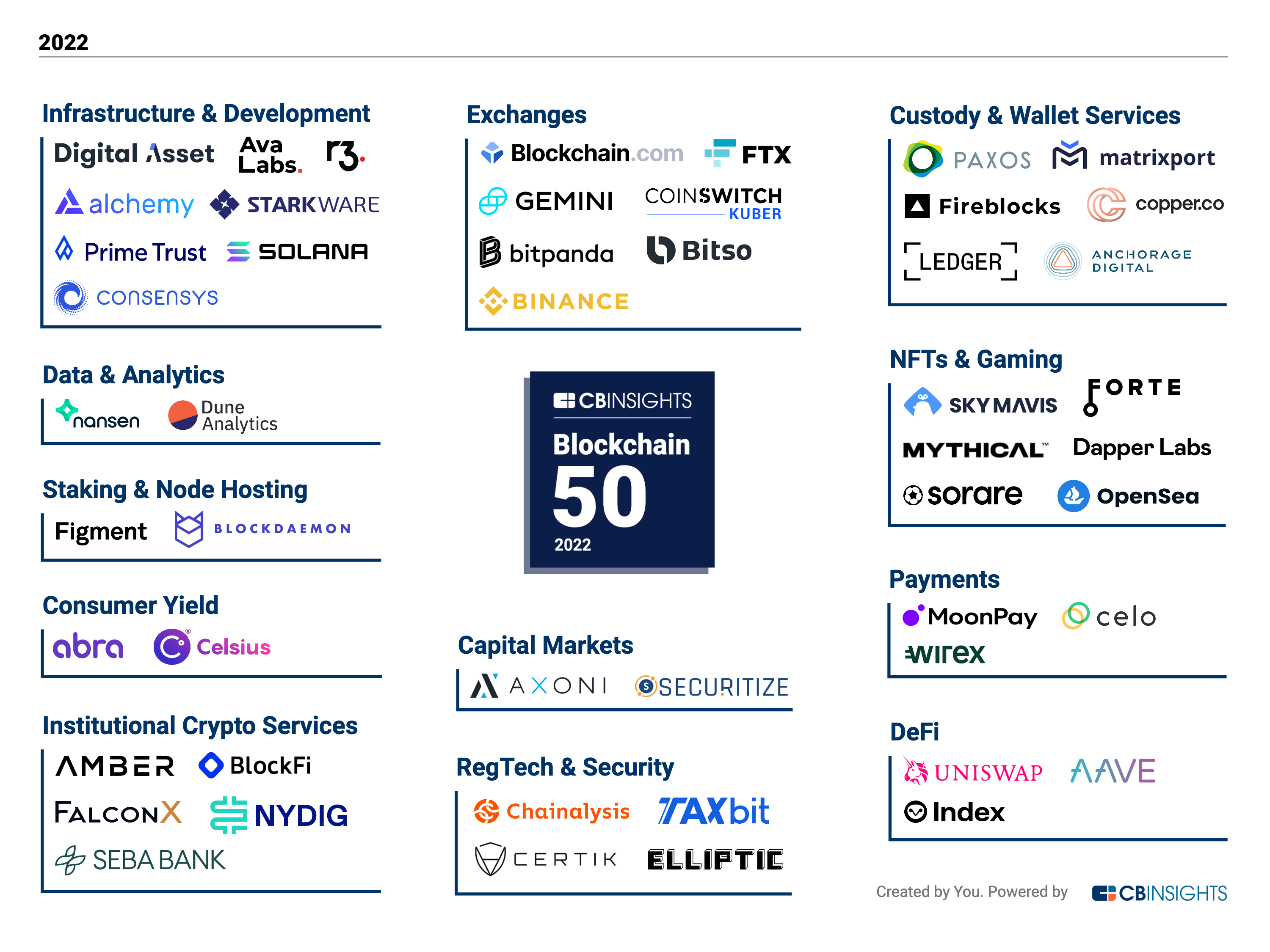 "2021 was the year blockchain entered our mainstream vocabulary,” said Brian Lee, SVP of CB Insights’ Intelligence Unit. "It powers some of our most innovative and cutting-edge technologies. Last year, we saw incredible success from the Blockchain 50 winners. This year, included among the winners we have 31 unicorns, 41 mega-rounds, and representation from 15 countries. We're excited to follow their journeys and see their success in 2022."