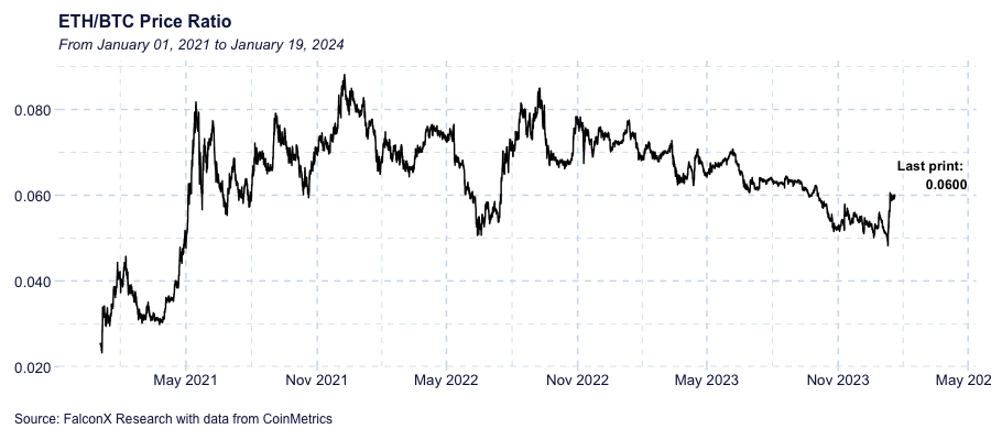 FalconX Trading Desk Color: As expected, BTC has led our desk activity following the spot ETF launch last week. BTC crossed our desks at more than 5x ETH’s volume, a ratio last surpassed only during the mid-2022 market turmoil. Most client personas, including ETF issuers, were better buyers, but hedge funds were more active on the sell side. Overall buy/sell ratios skewed above one for both BTC and ETH. Among alts, we saw buy interest in SOL and sell interest in Ethereum layer 2 projects such as ARB, OP, and MATIC.