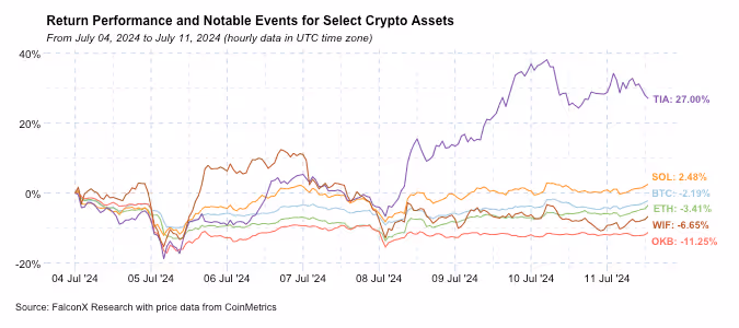 ETH and BTC continue to trade somewhat in tandem, with the ETH/BTC price ratio hovering around the 0.055 level, while SOL outperformed both majors. TIA recorded gains of almost 30% over the week despite a lack of clear news flow and funding rates in deep negative territory. Conversely, WIF and OKB continued to perform poorly and led losses among assets with a circulating market capitalization above $1 billion.