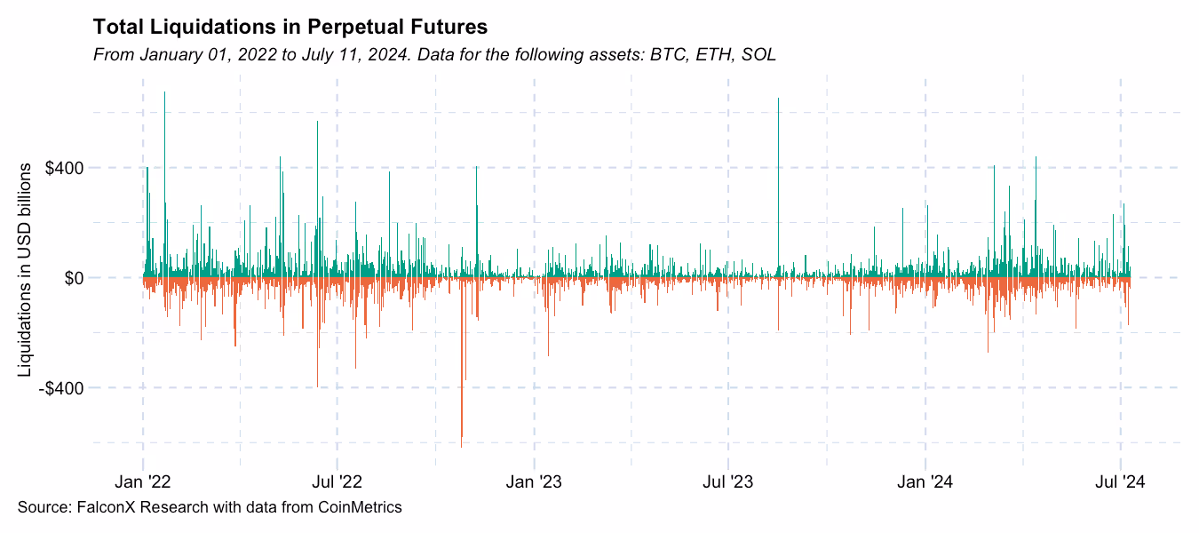 The drop in open interest has been steeper than the 13-17% price drawdown since mid-June, suggesting that the market has somewhat deleveraged. Case in point: liquidations of over $460 million in BTC, ETH, and SOL perpetual futures during the market correction on July 4 and July 5, with July 4 marking the fifth largest liquidation day in 2024.