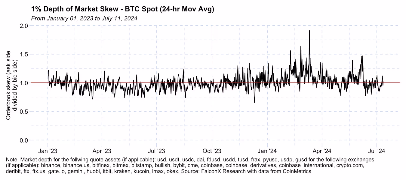 Perhaps a more general way to measure how well the selling pressure was cushioned is orderbook skew. Usually, during strong demand/supply imbalance periods, order books tend to become lopsided. The chart below shows how the 1% orderbook skew (ask side divided by buy side of the book) for the spot BTC market did not drift away from its regular balance this time in July.