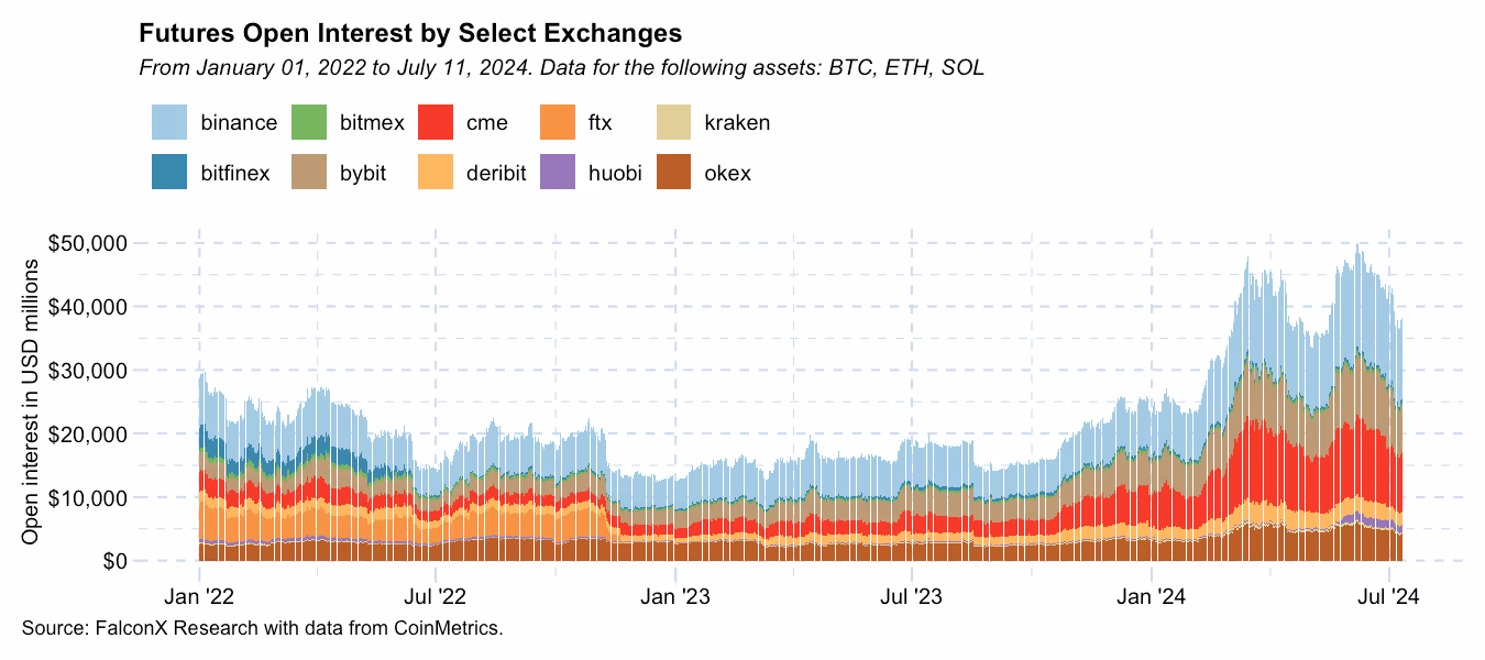 Significant Decline in Futures Open Interest for Larger Names Suggests Some Market Deleveraging: For the first time since May, the combined futures open interest in BTC, ETH, and SOL has fallen below $40 billion, following a peak of $50 billion in June. The decrease was distributed relatively evenly among exchanges and assets, with the CME losing 1% of the market share to Binance and the BTC losing half a percentage point to ETH and SOL.