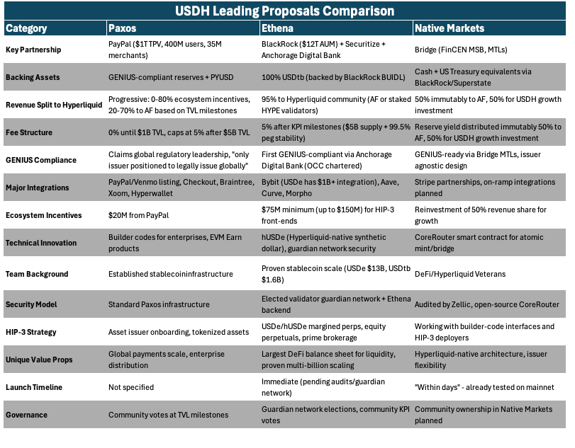 Unsurprisingly, the process has attracted many of the leading stablecoin teams, centralized and decentralized alike. Below, we summarize the proposals from the three leading contenders as measured by engagement in Hyperliquid’s Discord channel.