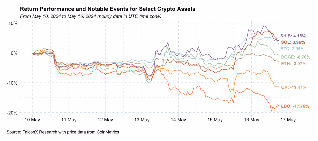 SHIB, DOGE, and SOL were among the best performers over the past seven days as assets that benefit from the meme mania got some lift after the re-emergence of Roaring Kitty. The Ethereum ecosystem, on the other hand, continues to lag. The ETH/BTC ratio touched 0.045, the lowest level in over three years.