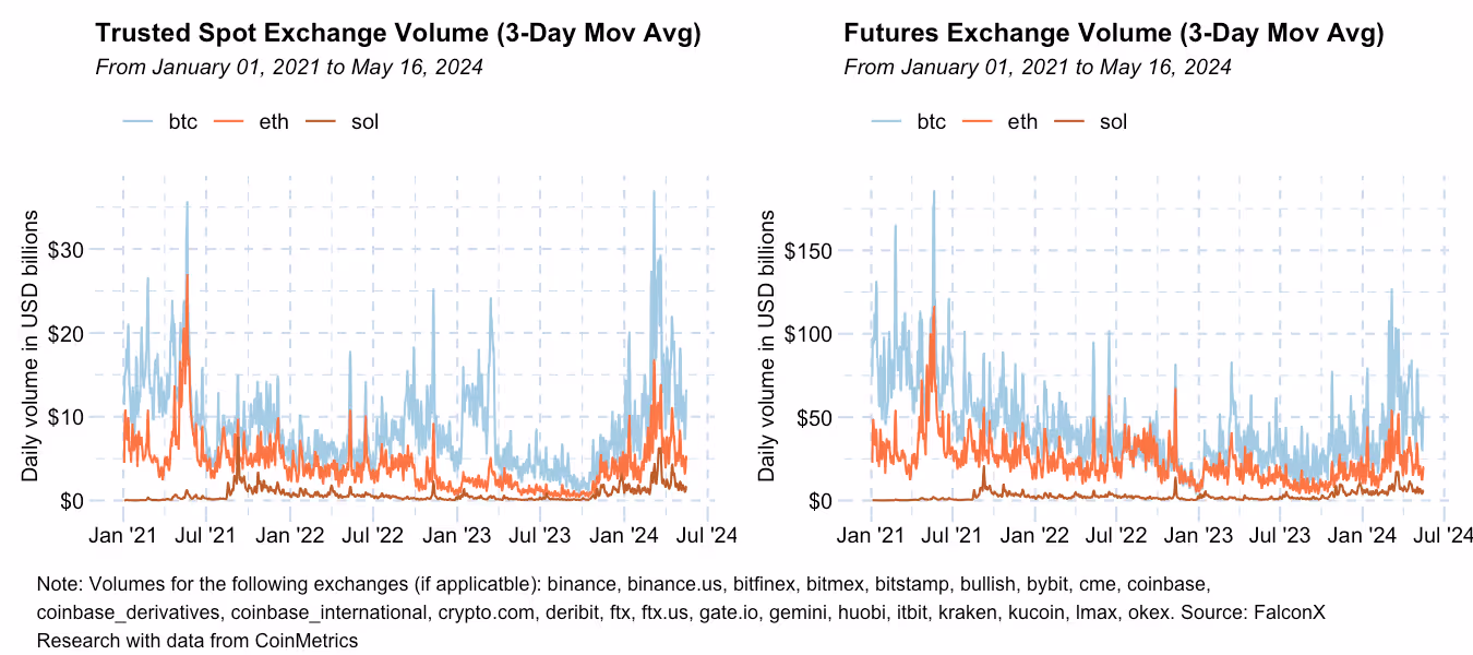 Spot and Futures Trade Volume Remain Soft, U.S. Flow Recovery Remains Essential for Price Action: As we have been highlighting since the beginning of April, trade volumes significantly shrunk after the end of March. The drop was more pronounced in the spot market, with BTC and ETH total volumes on trusted exchanges shrinking by 28% and 27% versus 22% and 26% in the futures market, respectively. Even the price recovery of the past three days has been supported by relatively soft volumes.