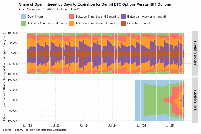 IBIT, on the other hand, launched with an outsized long-dated call footprint (six months to over a year) consistent with institutional hedges, long-tenor upside optionality, and overwrite programs. While through 2025 the belly (1–6 month tenors) has filled in, the long-tenor bias versus Deribit options remains.