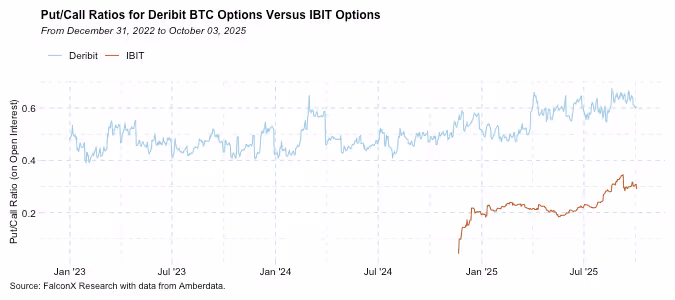As the chart below shows, put/call ratios run significantly higher on Deribit (hovering around the 0.5-0.6 range) and lower on IBIT (just recently building into the 0.3s). A credible interpretation of this data is that dealers and fast-money vol desks that need to hedge delta/gamma/vega continue to gravitate to Deribit; IBIT books must absorb close-to-open and weekend gap risk, so the flow could be skewing more toward programmatic call overlays and longer-dated structures that tolerate less re-hedging.