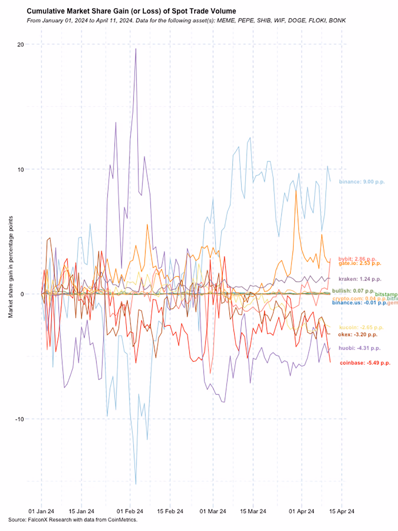 From an exchange perspective, Binance has been the main market share winner while Coinbase the main loser for those assets in 2024, especially after early March. This suggests that recent memecoin trading activity has been led by non-U.S. markets.