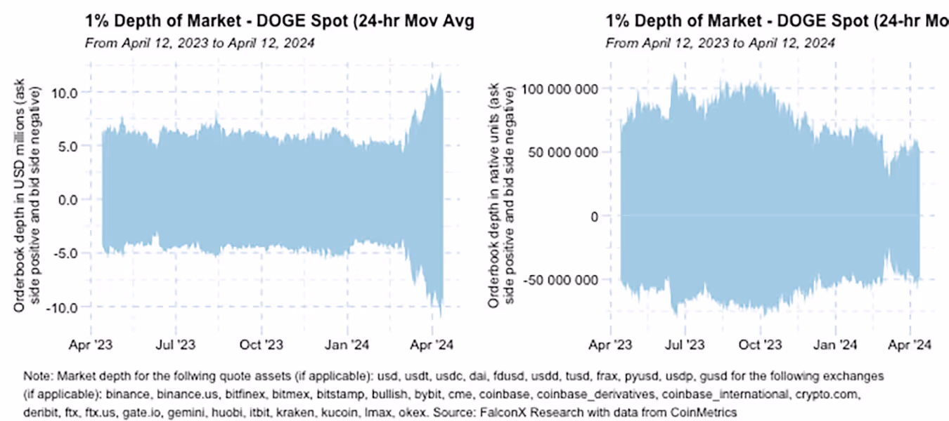 As the chart below shows, the 1% orderbook depth for DOGE and SHIB, the two largest assets in the space, is now at $10 million and $4 million on each side of the book, respectively.