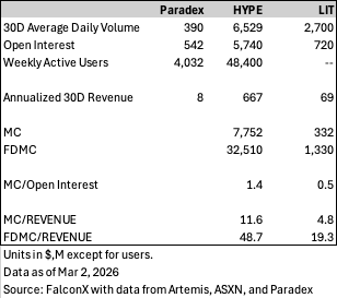 Comps for Paradex include peer perps DEXes HYPE and LIT. LIT may be especially relevant considering its token recently launched (December 2025) and because it is also experimenting with zero fee trading for retail. While Paradex’s volume and open interest may be lower than its peers today, its unique features, such as privacy, stand to drive more activity over time.
