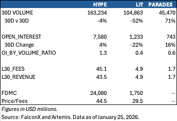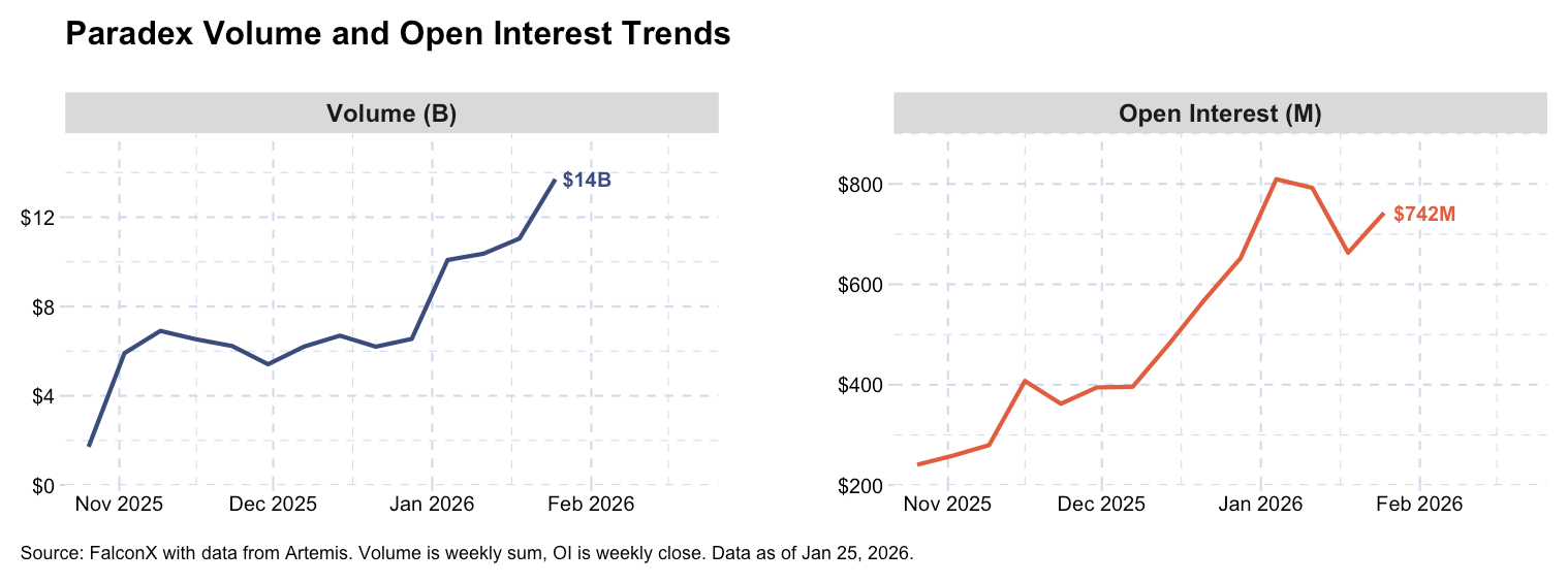 Its 30D volumes, as of January 25, 2026, are up 71% sequentially, according to data from Artemis. The trend has accelerated most recently with 7D volumes rising 8% from the prior week. Open interest of $743M is nearly 3x higher than in September 2025, highlighting its rapid growth. This is despite an incident on Jan 19, where a technical bug during a maintenance upgrade caused erroneous pricing, triggering liquidations. Paradex later performed a chain rollback to restore balances and positions to the pre-incident state, and refunded impacted accounts.